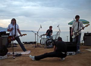 Later down at the beach, while the precise riffs of German duo Dyse bounced off the cliffs, accentuated by the brutal roar of a tortured larynx, The Staggers' inimitable front man Wild Evel showcased the last word in retro beachwear.